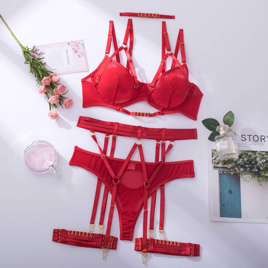 Solid Hollow Out Cage Silky Bra Panty Garter Belts
